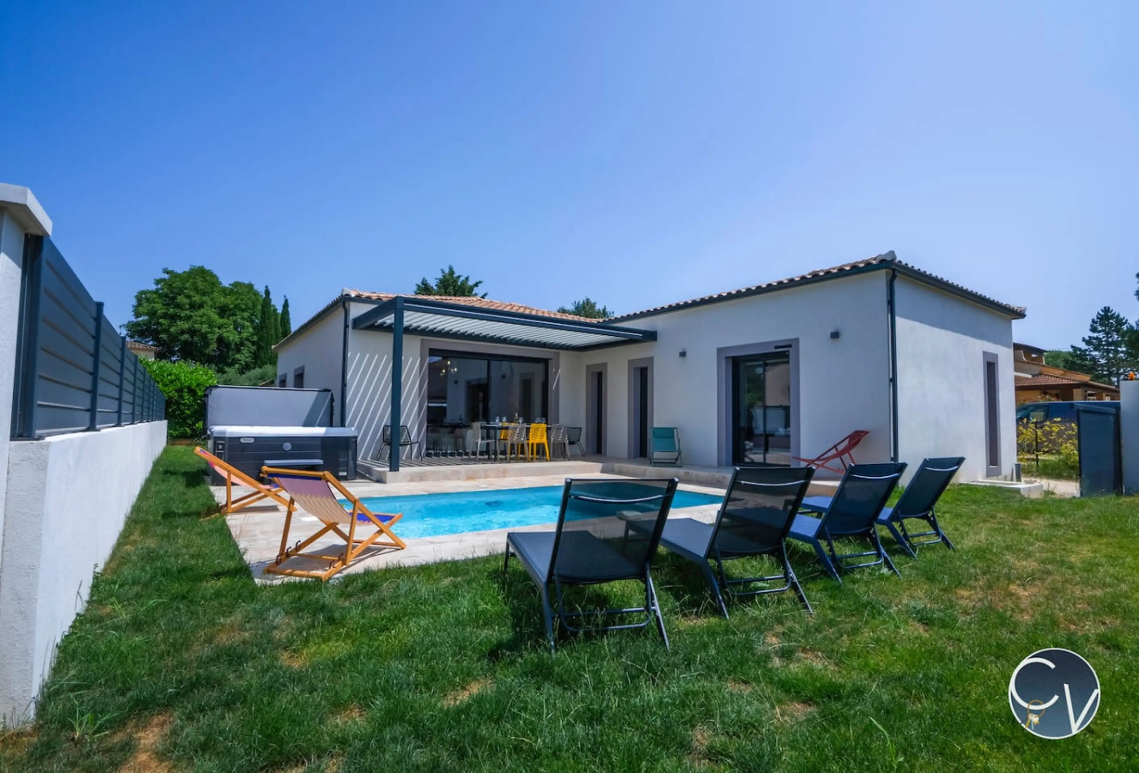 Cette magnifique villa moderne, baignée de lumière et décorée avec raffinement, vous promet un séjour inoubliable. Son intérieur allie confort et convivialité, tandis que ses équipements de qualité, dont un jacuzzi pour six personnes et une belle piscine, ajoutent une touche de luxe à votre séjour. ...